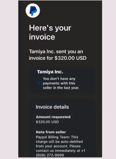 The email appears to be a genuine PayPal invoice, featuring Tamiya Inc.’s name, detailed invoice information, and a payment request. However, a major red flag is the phone number listed for the PayPal Billing Team, (808) 272-9698, which is not actually associated with PayPal.
