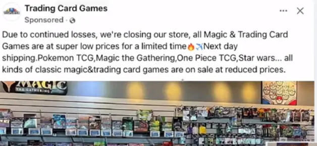 The Trading Card Games Closing Sale Facebook Scam is a fraudulent scheme where scammers impersonate the TCGplayer.com brand to deceive consumers into believing they are purchasing discounted merchandise from a legitimate closing house sale.