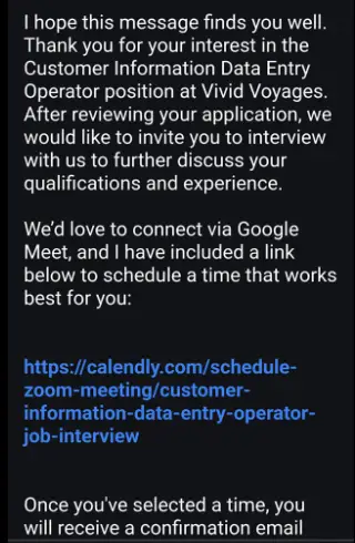 Scammers send a text on Whatsapp, Linkedin or Microsoft Teams claiming to be from Vivid Voyages and also offering a Customer Information data entry operator jobs with pay range of $30.15. This is however a scam. However when you receive this text and respond to them they trick you into paying a ”Application Fee”. People desperate for a job often fall victim to these type of scam and end up loosing their money and often times a victim of Identity fraud. So many people have complained online of receiving this type of scam recruitment text. There is also a conversation thread on Facebook about the Vivid Voyages job offer scam.