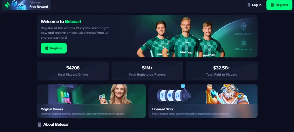 At first glance, Betesar.com looks like a high-end crypto gaming site. Slick animations, crypto logos, colorful game thumbnails, They promise:
