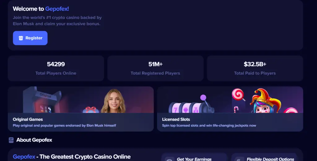 At first glance, Gepofex.com looks like a high-end crypto gaming site. Slick animations, crypto logos, colorful game thumbnails, They promise: