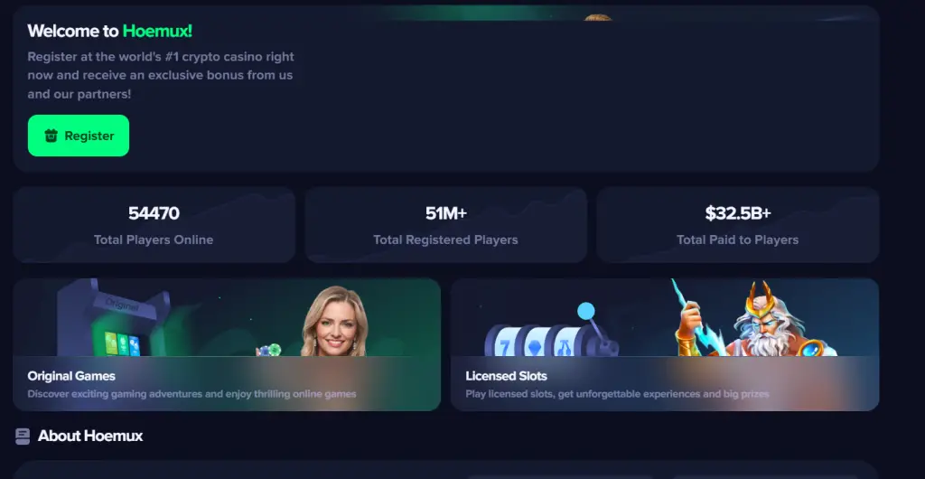 At first glance, Hoemux.com looks like a high-end crypto gaming site. Slick animations, crypto logos, colorful game thumbnails, They promise: