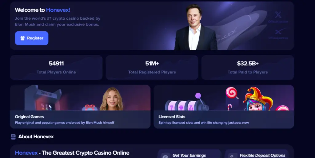 At first glance, Honevex.com looks like a high-end crypto gaming site. Slick animations, crypto logos, colorful game thumbnails, They promise: