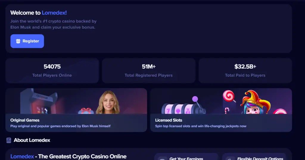 At first glance, Lomedex.com looks like a high-end crypto gaming site. Slick animations, crypto logos, colorful game thumbnails, They promise: