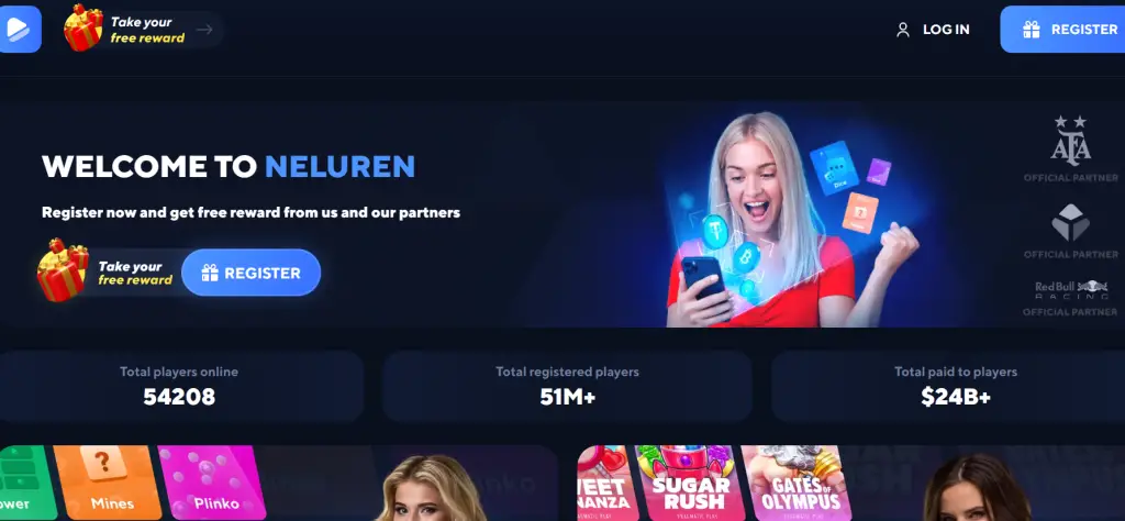 At first glance, Neluren.com looks like a high-end crypto gaming site. Slick animations, crypto logos, colorful game thumbnails, They promise: