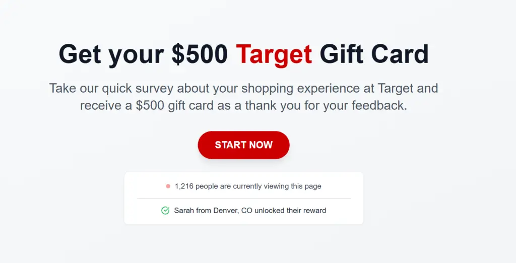 The $500 Target Gift Card Scam on TrgtReview.com is mostly perpetrated on Social media. It involves Ads on Social media platforms like Facebook, etc When you click on the Ads it takes you to a website, TrgtReview.com and in this website you get options asking you to click below in order to claim your $500 Target Gift Card. It also asks you to enter you email, basic info, complete a product survey, complete recommended deals and then you can qualify to receive your gift card. Only when you Click on Start Review it redirects you to a suspicious website.