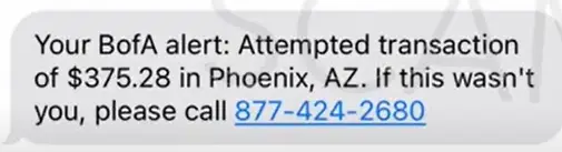 “Your BofA alert: Attempted transaction of $375.28 in Phoenix, AZ. If this wasn’t you, call (844) 587-5633.”