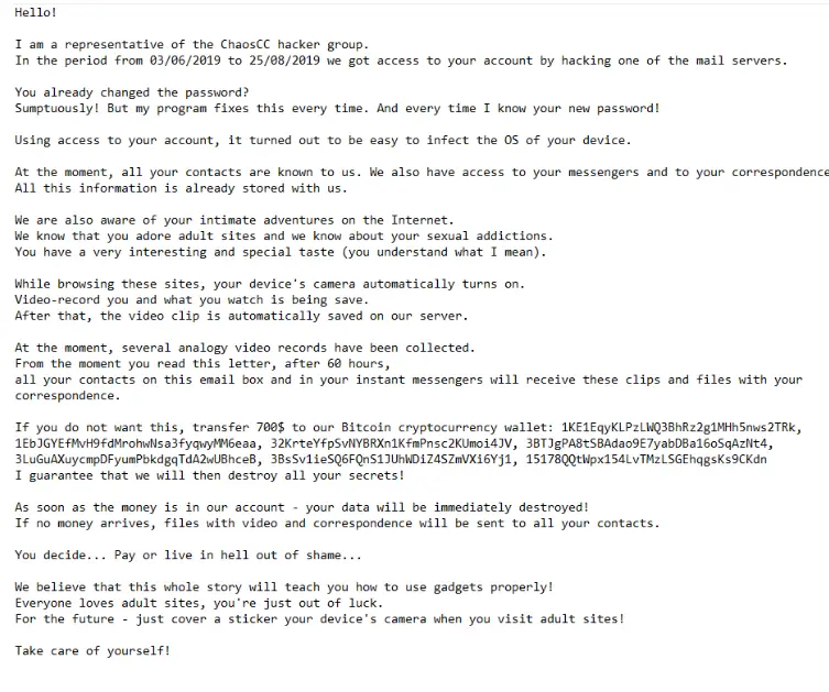 Have you received an Email saying they are representative ChaosCC Hacker Group of have evidence of lewd or offensive acts you have been doing and asking you to send money to a bitcoin address? Do you want to find out if it is a scam or legit mail? Read this review to find out!