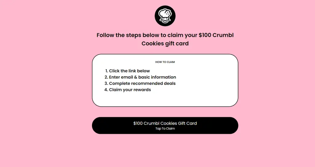 Cookies-100.com claims to offer a $100 Crumble Cookies gift card, requiring users to click a link, provide their email and personal information, and complete various deals to claim the reward.