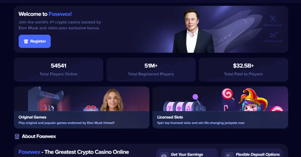 At first glance, Fosewex.com looks like a high-end crypto gaming site. Slick animations, crypto logos, colorful game thumbnails, They promise: