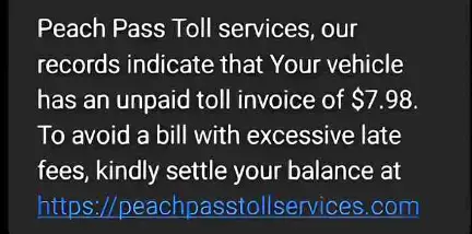 What The GA Peach Pass Scam Toll Services Text Looks Like