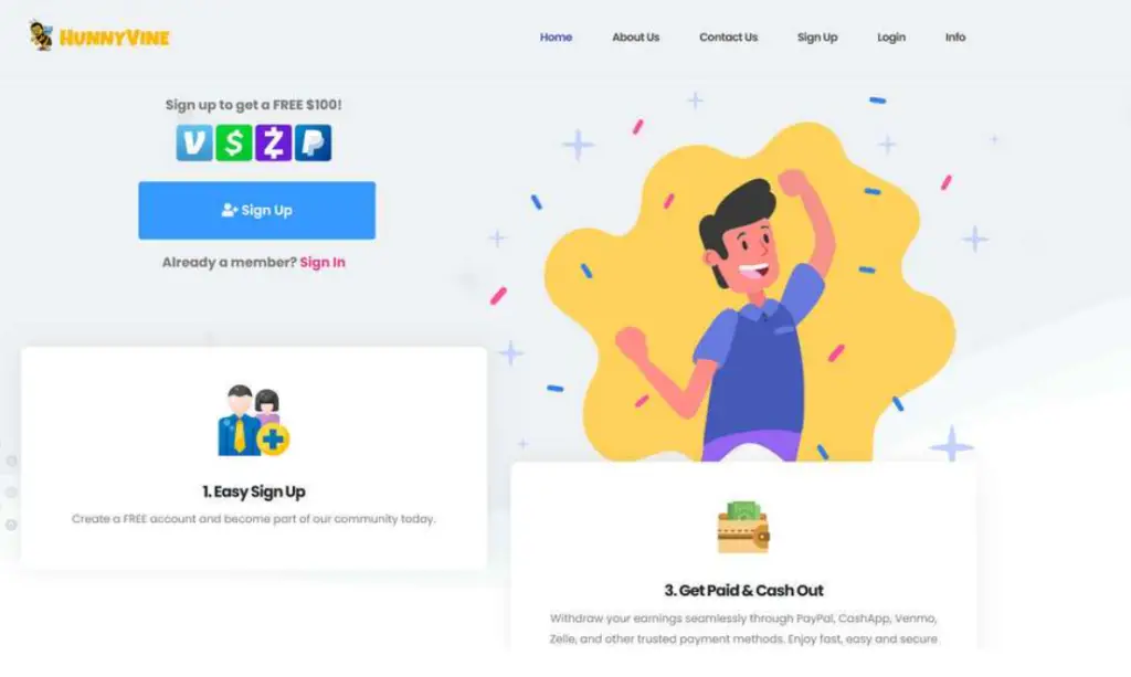 Hunnyvine.com appears to be a scam by enticing users with false promises of easy money, collecting their personal data, and using a referral pyramid scheme without providing real earnings. Always exercise caution and perform due diligence before engaging with any online earning platform.