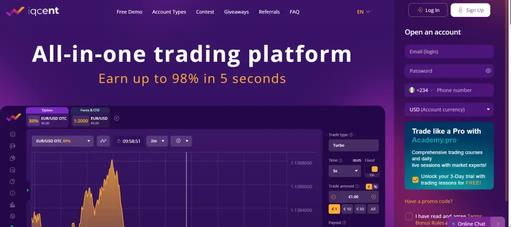 IQCent is an online trading platform that offers binary options, forex, and CFD trading with a low minimum deposit requirement. While it presents itself as a user-friendly platform suitable for beginners, several aspects raise concerns about its legitimacy and reliability.​