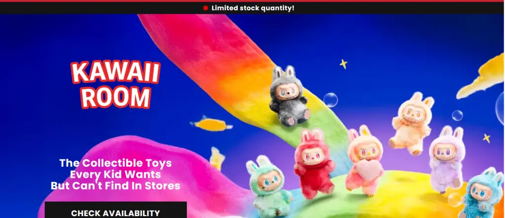 Kawaiiroom.com claims to be an online toy store selling collectible designer toys, including, Labubu monsters and figurines, POP MART collectibles, Limited edition art toys, etc. They use enticing images and “only 3 left!” scarcity tactics to push impulse buys. But the truth? Kawaiiroom is not a legitimate retailer, and there’s zero proof that they ever deliver what they promise.
