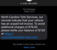 The NC Quick Pass Toll Scam Text looks is a scam text sent by scammers impersonating NC Quick Pass Toll Services. They send a text saying, ”your vehicle has an unpaid toll invoice. To avoid additional charges, of $76.00 please settle your balance at ncquickpasstollservices.com” They also ask you to settle the penalties before a given date through a link that’s contained in the text. But this is a scam link. These Scam links and phishing are deceptive practices designed to trick individuals into revealing personal information, downloading malicious software, or making fraudulent transactions.