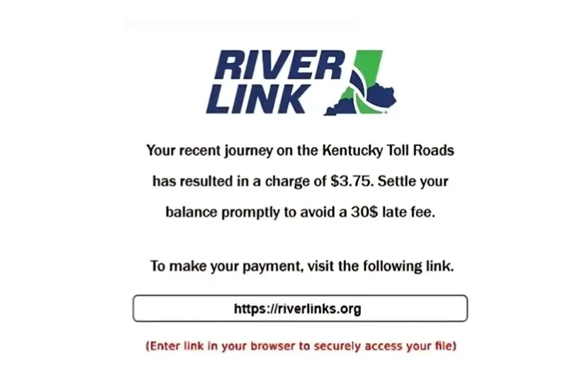RiverLink has clarified they do not send toll notifications via text—official toll communications are done through mail. These scam texts often appear from numbers like “RiverLinks” or “Kentucky Toll Roads,” making them seem legitimate.