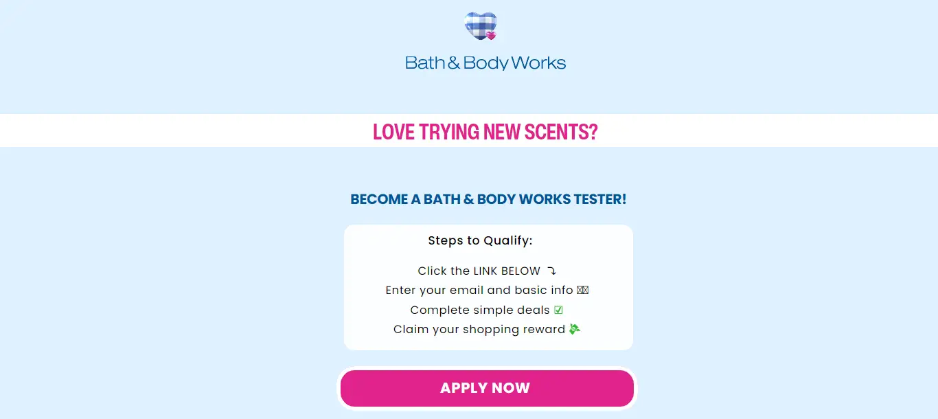 - First you have to join their rewards program. Bath & Body Works has a rewards program where loyal customers can earn points for purchases, which can sometimes lead to exclusive testing opportunities. You can Sign up for their rewards program and regularly check for any tester recruitment announcements.